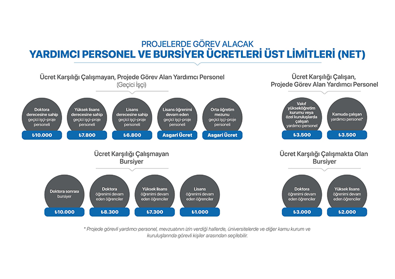TÜSEB Proje Destek Programları kapsamında desteklenen projelerde görev alacak lisans, yüksek lisans ve doktora bursiyer ve yardımcı personel ücretlerinin üst limitleri güncellendi.